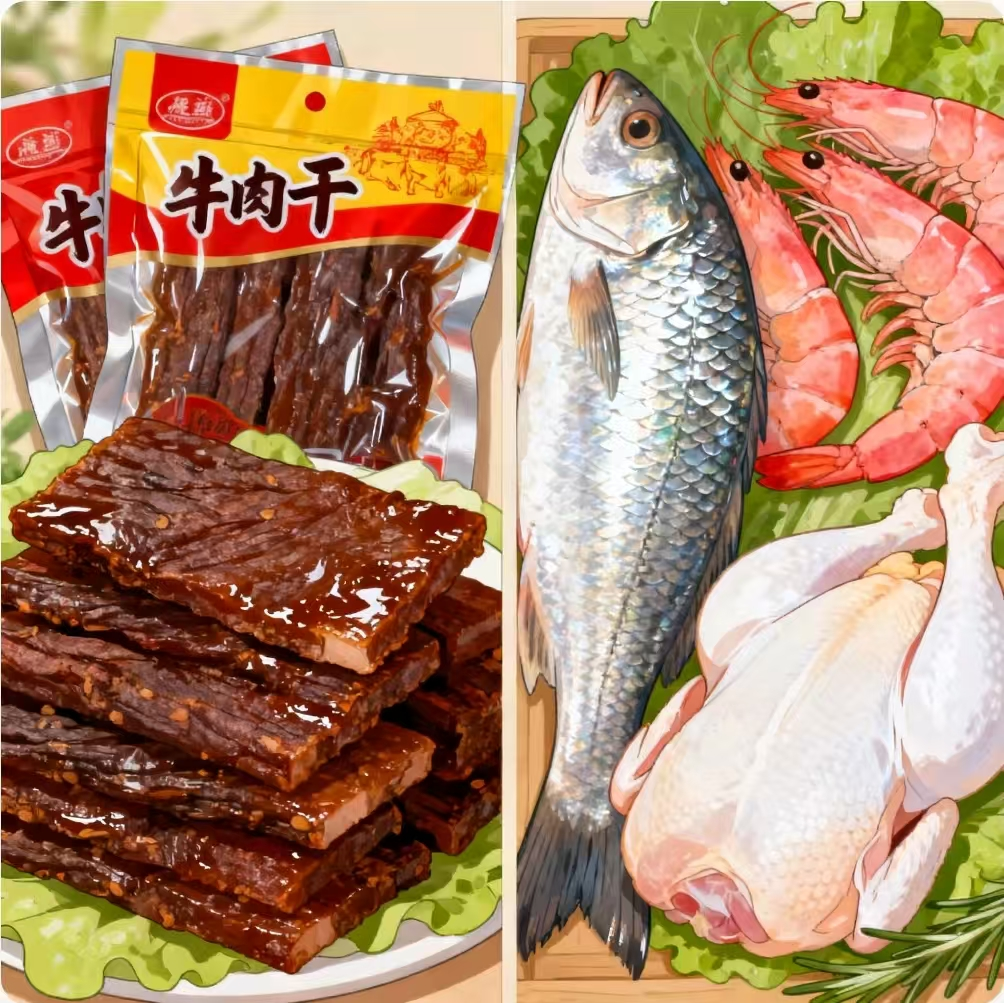 上榜食物: 猪肉脯、牛肉干、鱿鱼丝等加工肉制品。