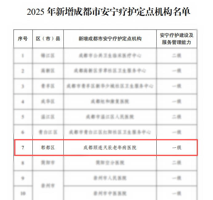 2025年12月2日,成都市卫生健康委员会正式发文,成都顾连天辰老年病医院被纳入2025年新增安宁疗护定点机构。这一资质认定,不仅标志着我院在终末期患者照护领域的专业能力获得权威认可,更意味着成都地区安宁疗护服务资源得到进一步充实,能为更多疾病终末期患者及其家庭提供系统、专业、人性化的生命末期支持。